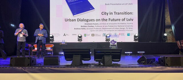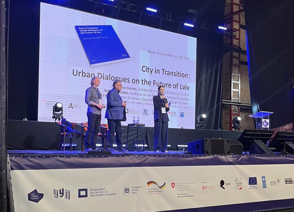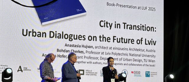 The book presentation that evening was given by authors Andreas Hofer, Anastasia Hujvan and Bohdan Cherkes. Numerous other protagonists and authors of the book also spoke, including the Mayor of Lviv Andriy Sadovyi, Chief Architect Anton Kolomieitsev, the architects Maryna Peleshchak, Olena Tribusian, Oleksandr Fenchuk, Solomiia Shcheholska and Christian Gigler, as well as representatives of Dom Verlag Philipp Meuser and Björn Rosen.